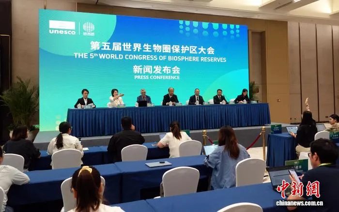 9月25日下午,第五届世界生物圈保护区大会在杭州闭幕后举行新闻发布会。中新网记者 孙自法 摄