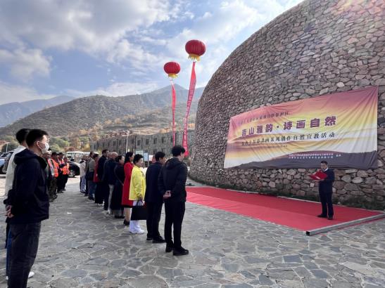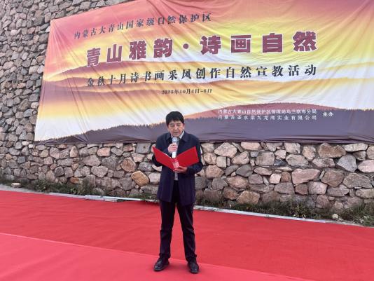 开幕仪式在九龙湾庄重举行,内蒙古自治区大青山自然保护区管理局乌兰察布分局相关领导率先登台致辞,随后参与活动的企业代表与诗书画家代表先后发言。开幕仪式结束后,全体参与者开启了丰富的采风之旅,大家沿着精心规划的路线深入户外写生打卡地。工作人员详细介绍了大青山植被、地貌、人文、历史、生态环境及当地红色历史文化故事。近距离观察白桦、山杨等原生树种的生长形态,触摸岩石上的地衣与林间的苔藓,感知这些平时容易被忽略的“自然细节”,为后续的文化创作积累鲜活素材。