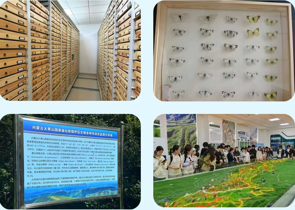 上左图为昆虫标本收藏室 上右图为蝴蝶标本 下左图为保护区生物多样性动态监测大样地简介展示牌 下右图为北京林业大学生态与自然保护学院赴管理局实习现场