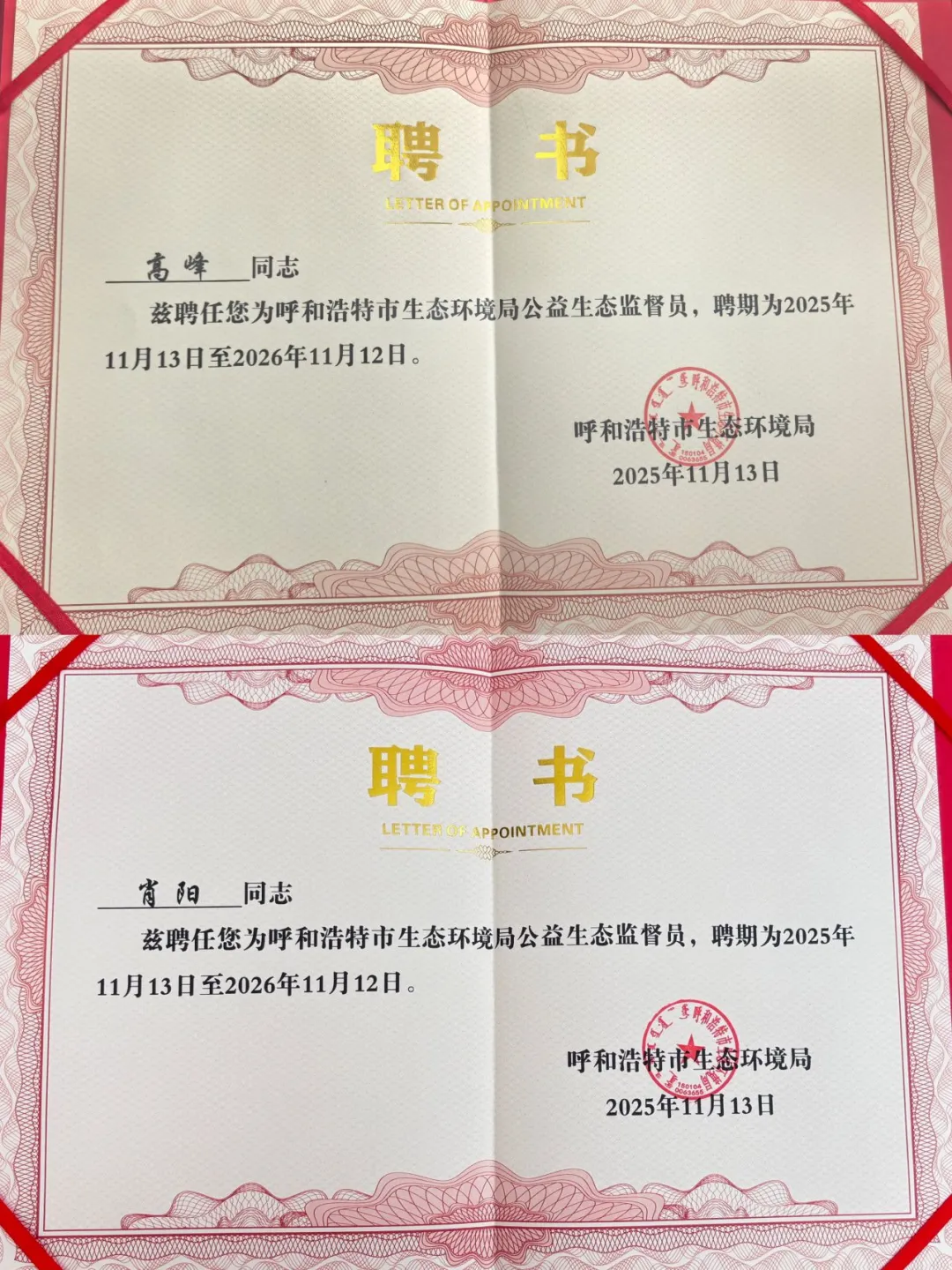 11月13日,呼和浩特市公开选聘公益生态监督员和生态观察员工作圆满结束。经严格选拔,全市共20名优秀代表受聘。其中,内蒙古自治区大青山国家级自然保护区管理局呼和浩特分局资源保护科科长高峰与五家村管理站护林员肖阳,因在生态环境保护领域的扎实工作和突出表现光荣入选。