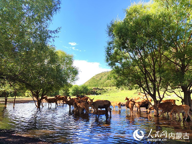 麋鹿在夏日的大青山山涧饮水、嬉戏。受访者供图